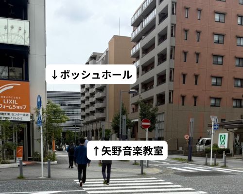 ボッシュホール手前の右手に教室の入っている「センター北ミレナリオビル」が見えます。