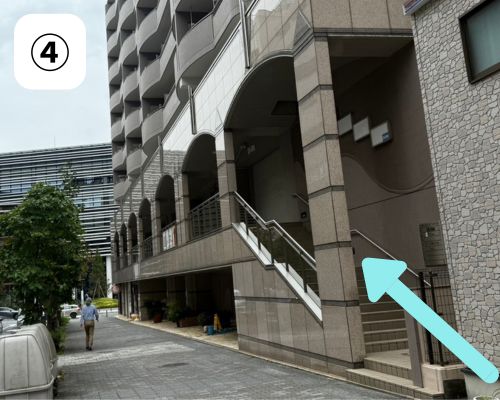 ④ 階段から2階に上がり、正面ドアのインターホンを押してください。(エレベーターはありません。)