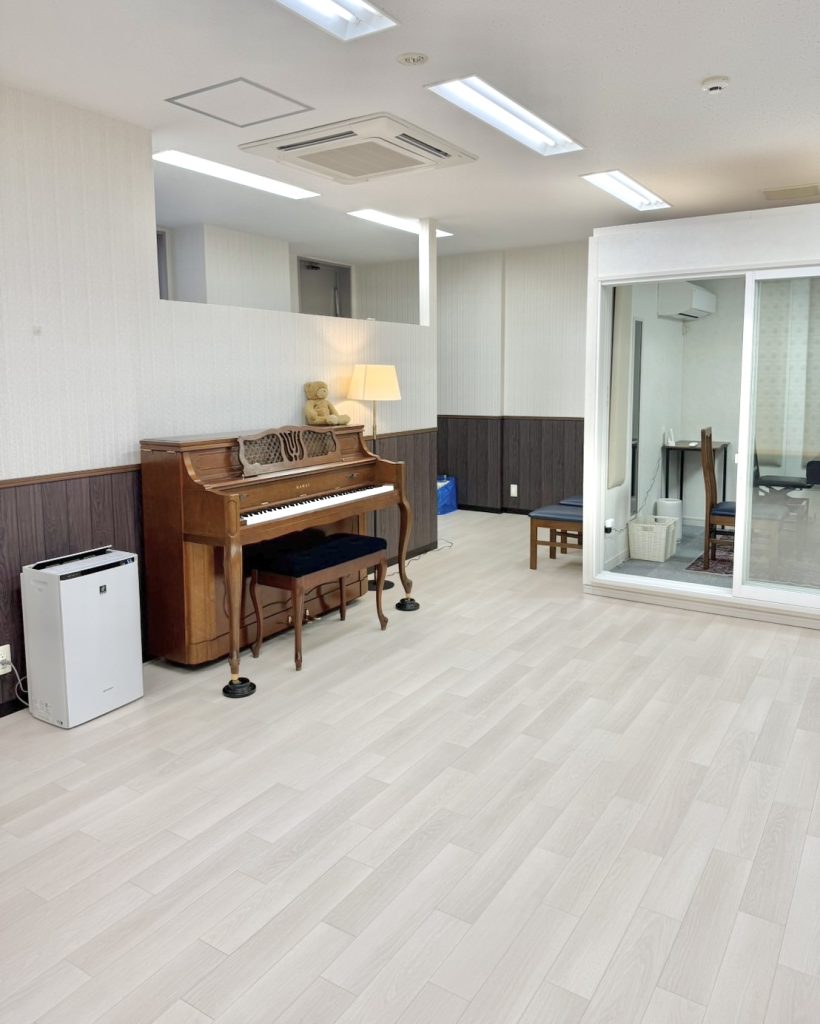・グループレッスン用の広いお部屋(アップライトピアノ)と、個人レッスン用の防音ルーム(グランドピアノ)がございます。大きな窓&白を基調とした明るい雰囲気の教室です!